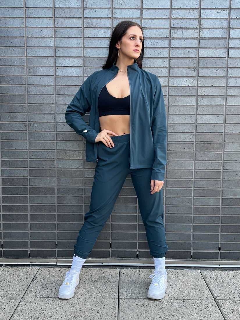 Alyssa is 5'8" and wearing a size medium Warmup Kit and size large tshirt
